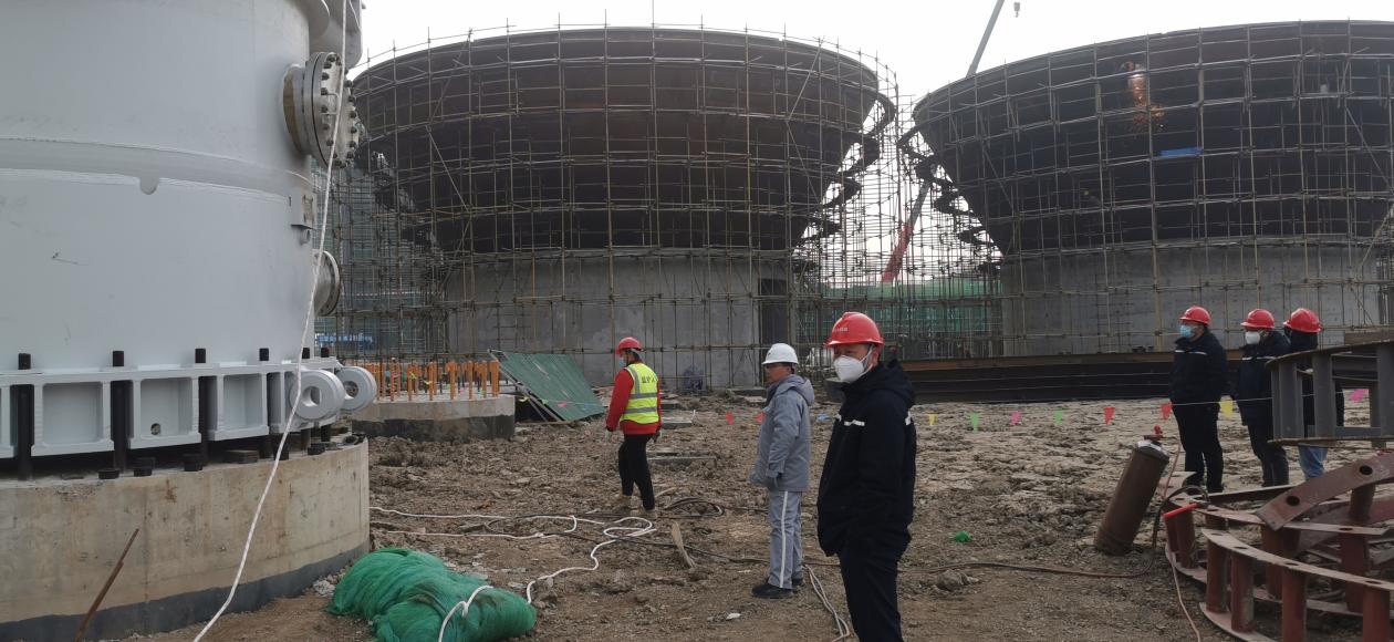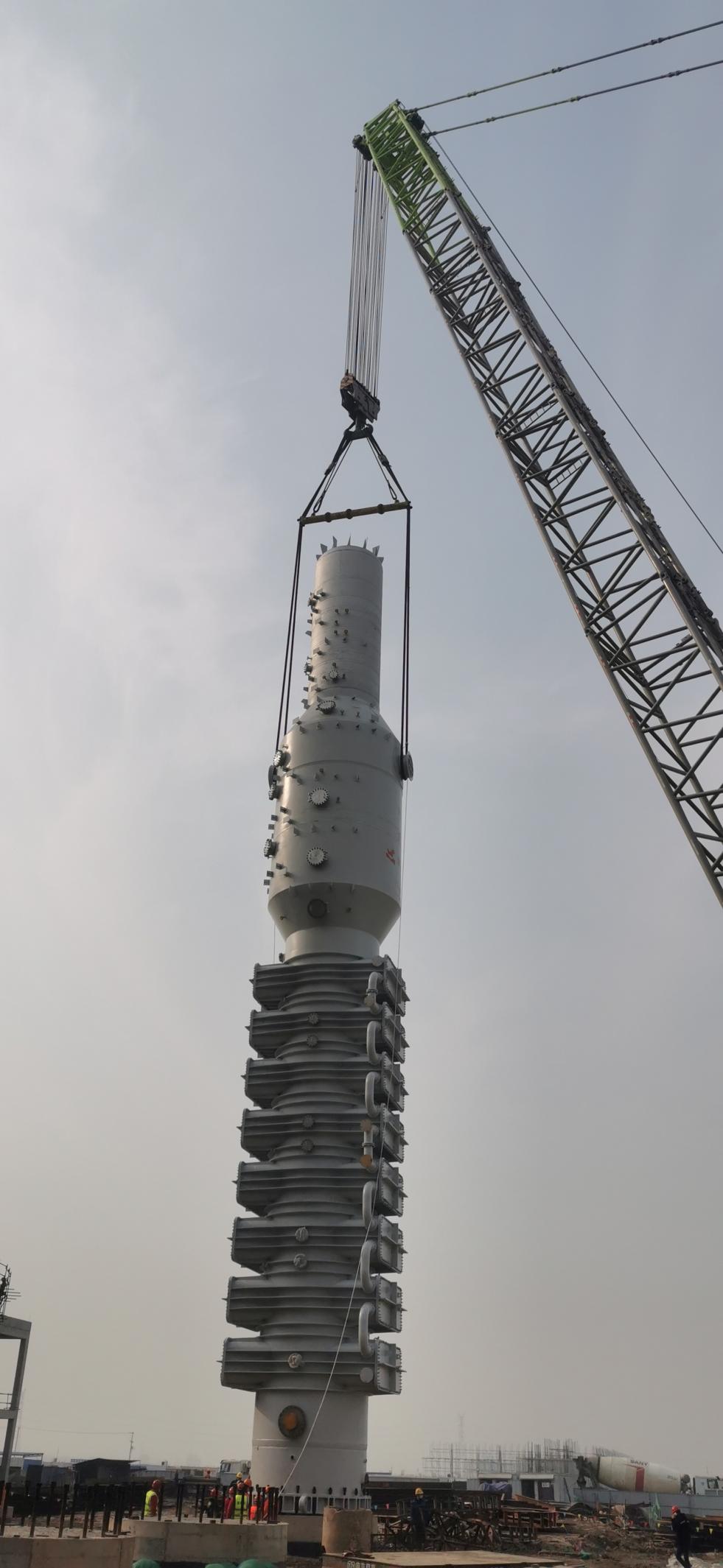 2022年12月30日上午,在即將迎來2023年新年之際,興華科技公司聯堿裝置區建設現場正呈現一片火熱的安裝景象,聯堿最重要的核心設備之一碳化塔,迎來了隆重的安裝典禮,公司總經理卓士彬、副總經理潘杭軍、朱愛民等主要領導親臨現場,見證了這一令人激動的時刻。8:48分,安裝現場鞭炮齊鳴,建設單位向卓士彬總經理匯報一切準備就緒之后,隨著卓總的一聲令下, 1臺800噸和1臺350噸吊車相互配合,重達300多噸的碳化塔被緩緩吊起,聯堿項目部李志經理親自把關設備方位、標高、找正等技術關鍵點,確保一次準點到位,經過1個多小時的調整,第一臺碳化塔穩穩得座落在設備基礎之上,經過公司能源動力部、項目部、監理單位以及施工方多次反復確認,確保碳化塔精準無誤地落在基礎上面,圓滿安全地完成了第一臺碳化塔起吊安裝工作,標志著興華科技聯堿設備安裝開始進入一個新的高潮。目前聯堿整個設備安裝預計在元旦和年后即將全面鋪開,為項目建設如期開工,興華科技公司全體員工都在全力拼搏。